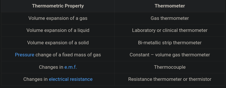 The following table shows some of the thermometric properties of matter that are used in the various thermometers: